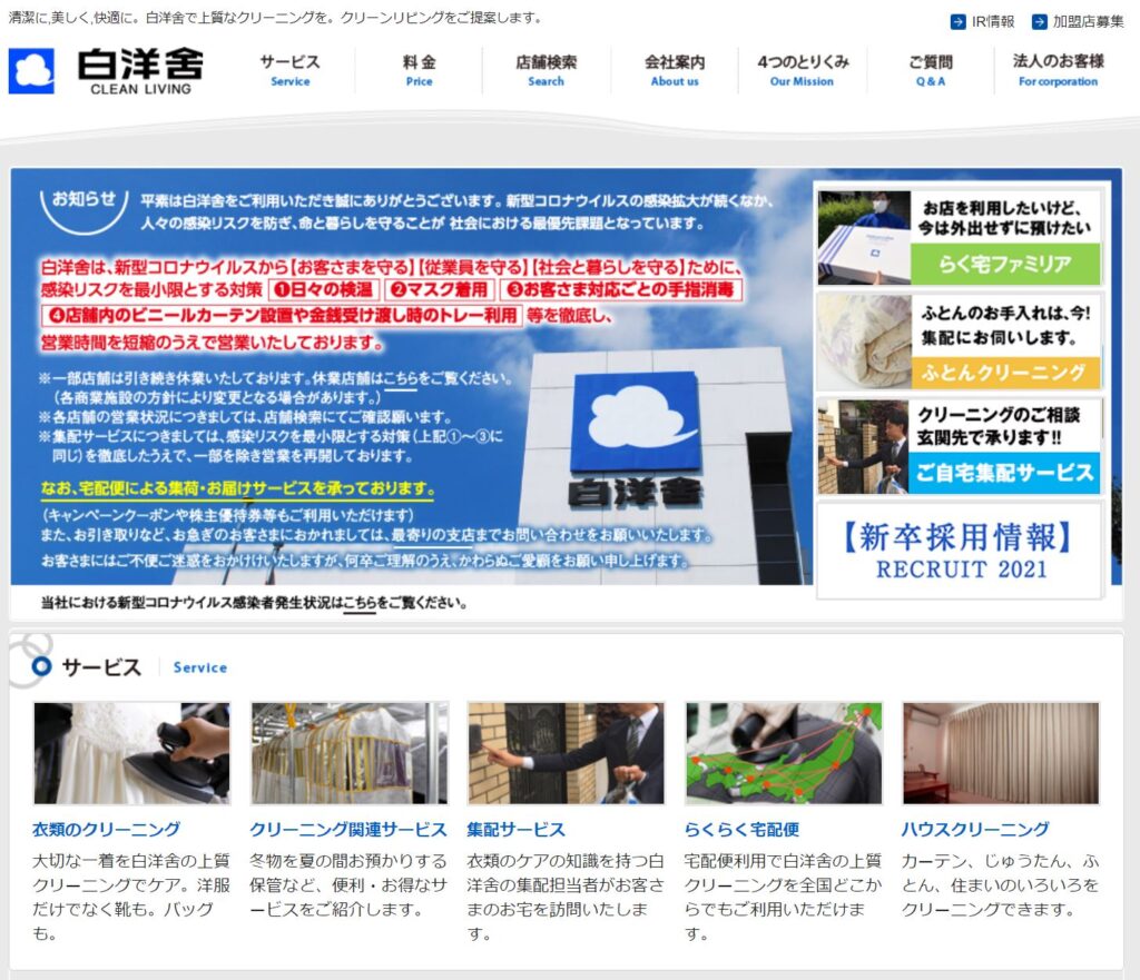 白洋舎は大手のクリーニングチェーンになります。店舗を見た事が無い人は居ないのではないでしょうか。