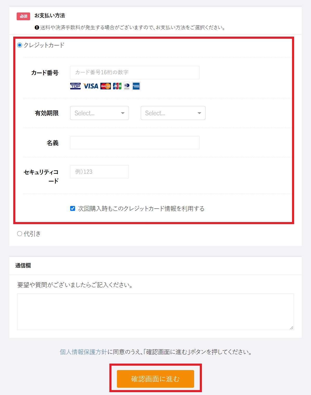 6.支払方法を選択(クレジットカードまたは代引き)し、クレジットカードを選択した場合はカード情報を入力します。その後、『確認画面に進む』を選択します