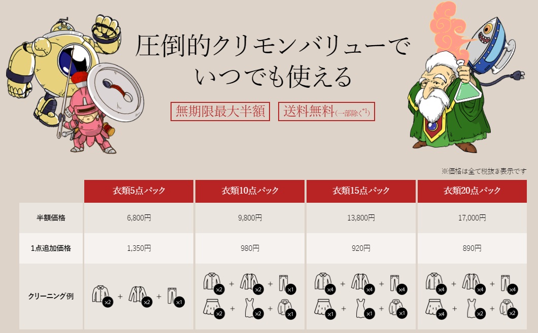 各コースによって、適用されるキャンペーンが異なり、最もお得になるのは衣類20点パックです。(実質25着の衣類をクリーニングする事ができます)