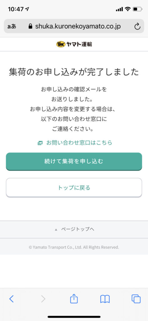 衣類のパッキングが完了したら、スマートフォンなどからヤマト運輸に集荷を依頼します。