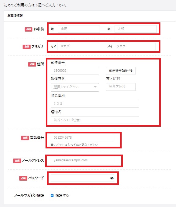 5.アカウントをお持ちの方は『メールアドレス』『パスワード』、初めての方は『氏名』、『住所』、『電話番号』、『メールアドレス』、『パスワード』を入力します
